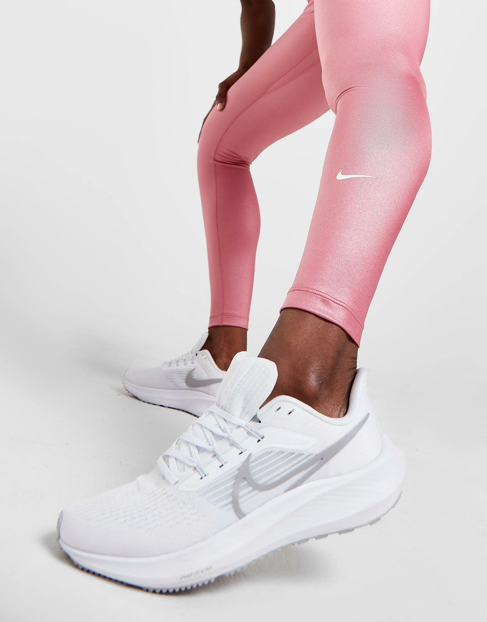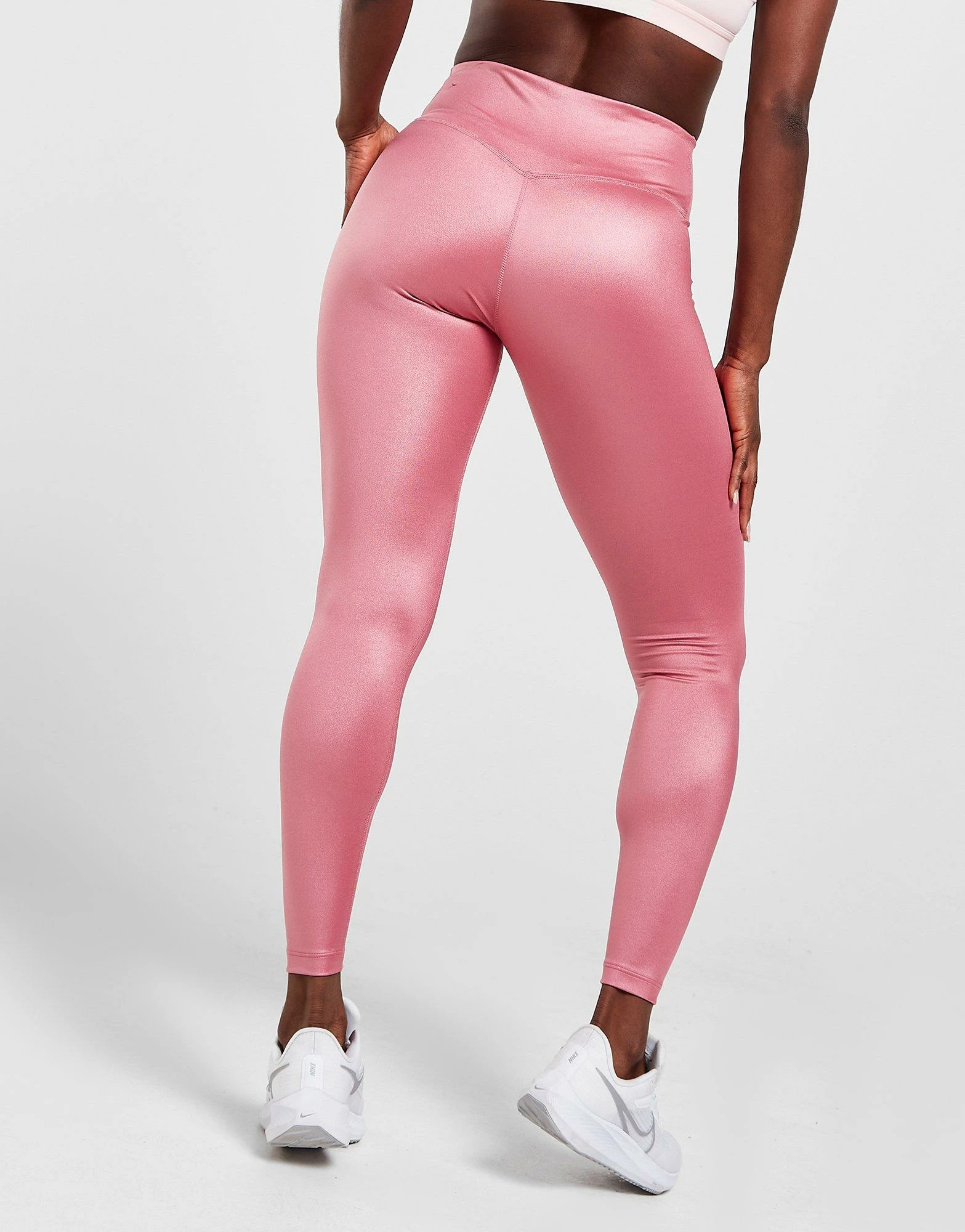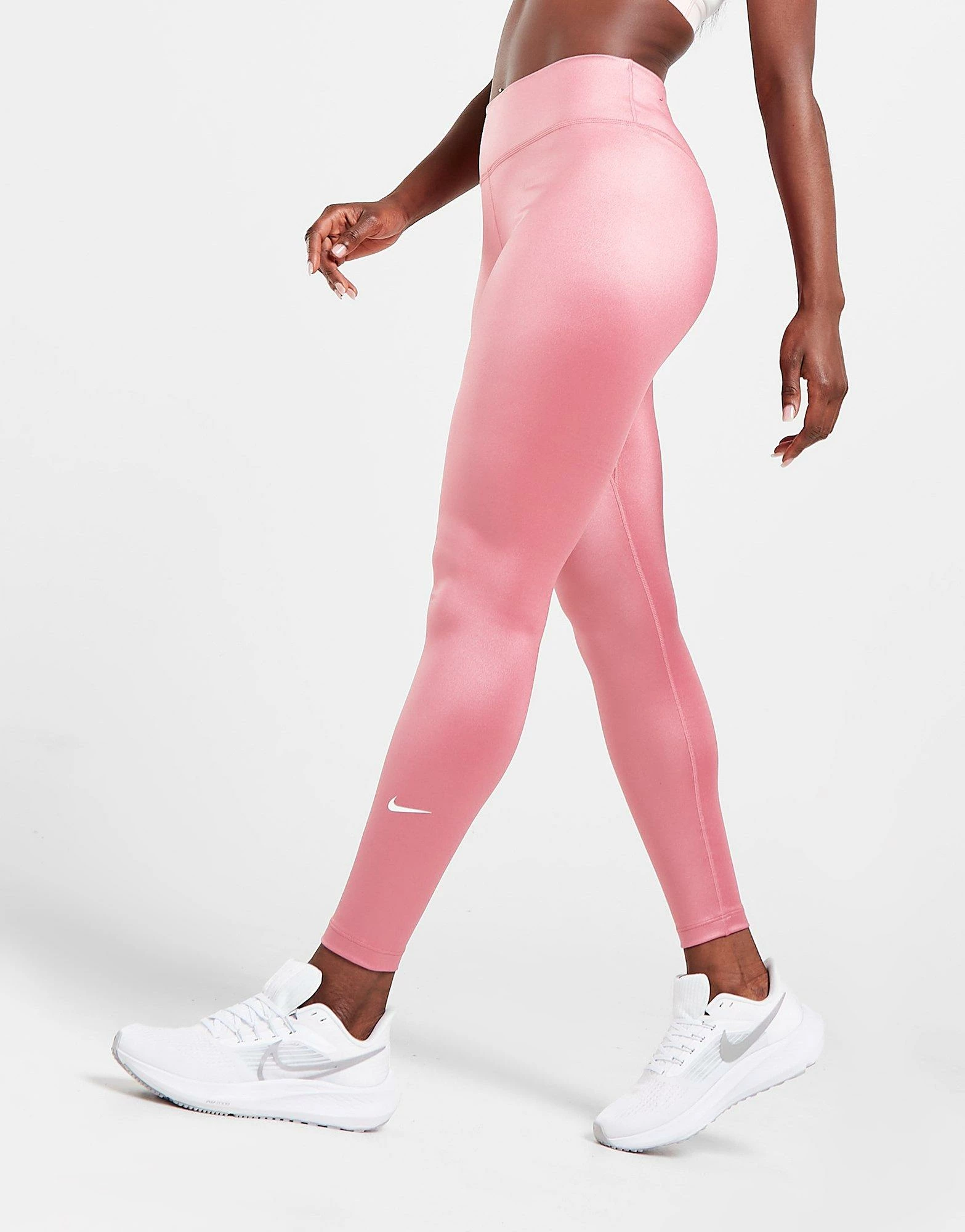 Smash your workout in these women’s Training Swoosh Shint Tights from Nike. Coming in a Desert Berry colourway, these tights are cut from smooth, stretchy poly fabric with a high-shine, non-sheer finish for supreme comfort. Built with sweat-wicking Dri-FIT tech, these tight-fit leggings feature a mid-rise elasticated waistband with a contoured V shape for a secure, flattering feel. They have two hidden pockets in the waistband for secure storage, and are finished up with signature Swoosh branding at the thigh. Machine washable. | Our model is 5’6″ and wears a size small.