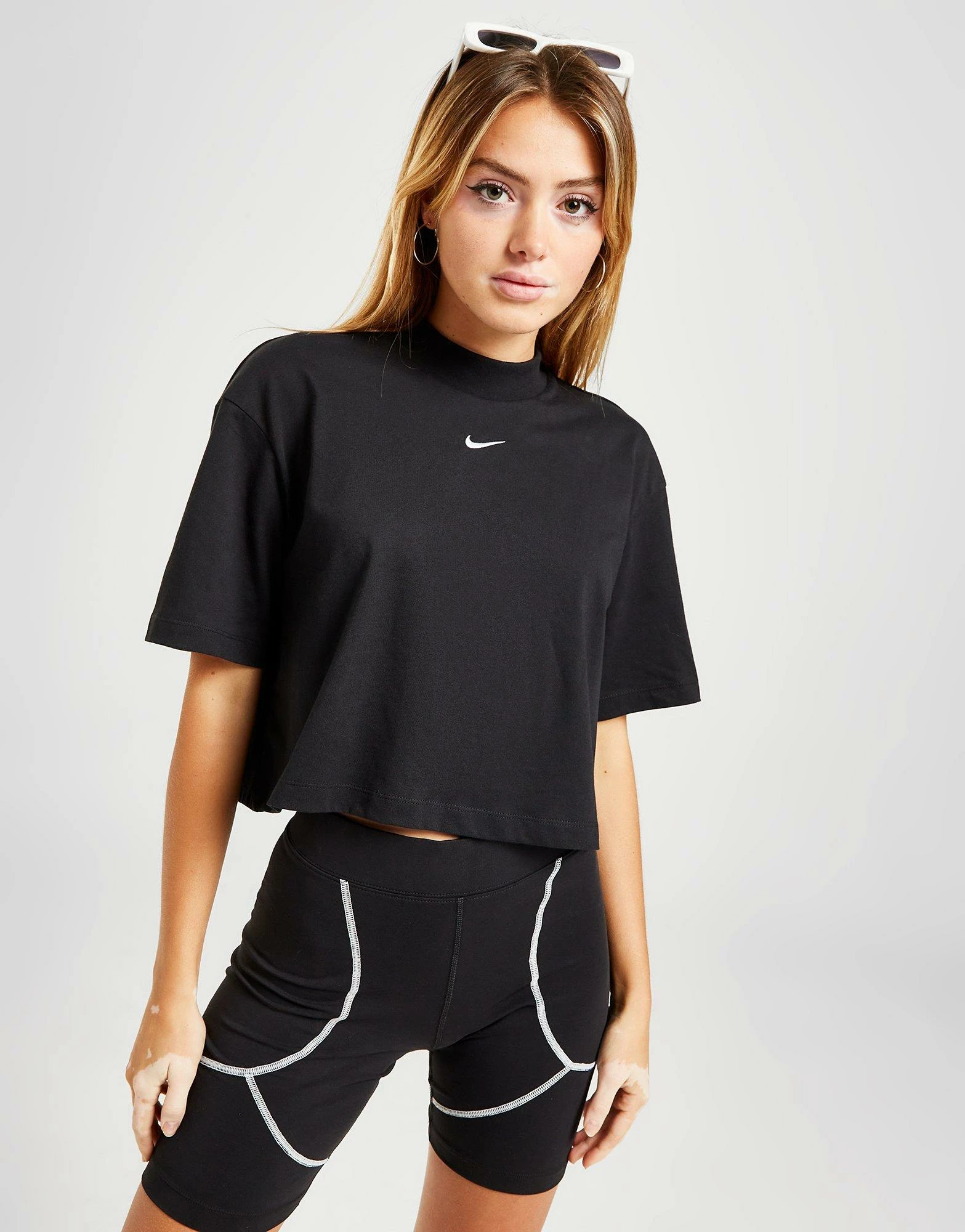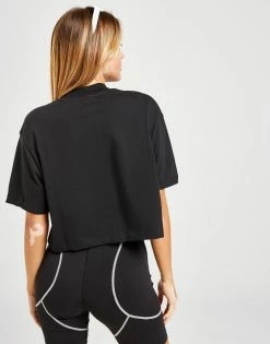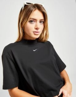From brunch dates to sofa chills, cop a sport-casual look in this women’s Essential Boxy Mock Neck T-Shirt from Nike. In a Black colourway, this roomy top is made from soft cotton fabric for everyday comfort. It features dropped shoulders, baggy sleeves and a ribbed mock neckline, while a cropped hem keeps it light and airy. This tee is signed off with a contrasting Swoosh logo to the chest. Machine washable. | Our model is 5’8″ and wears a size small.