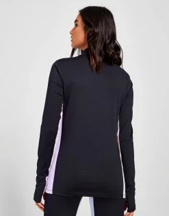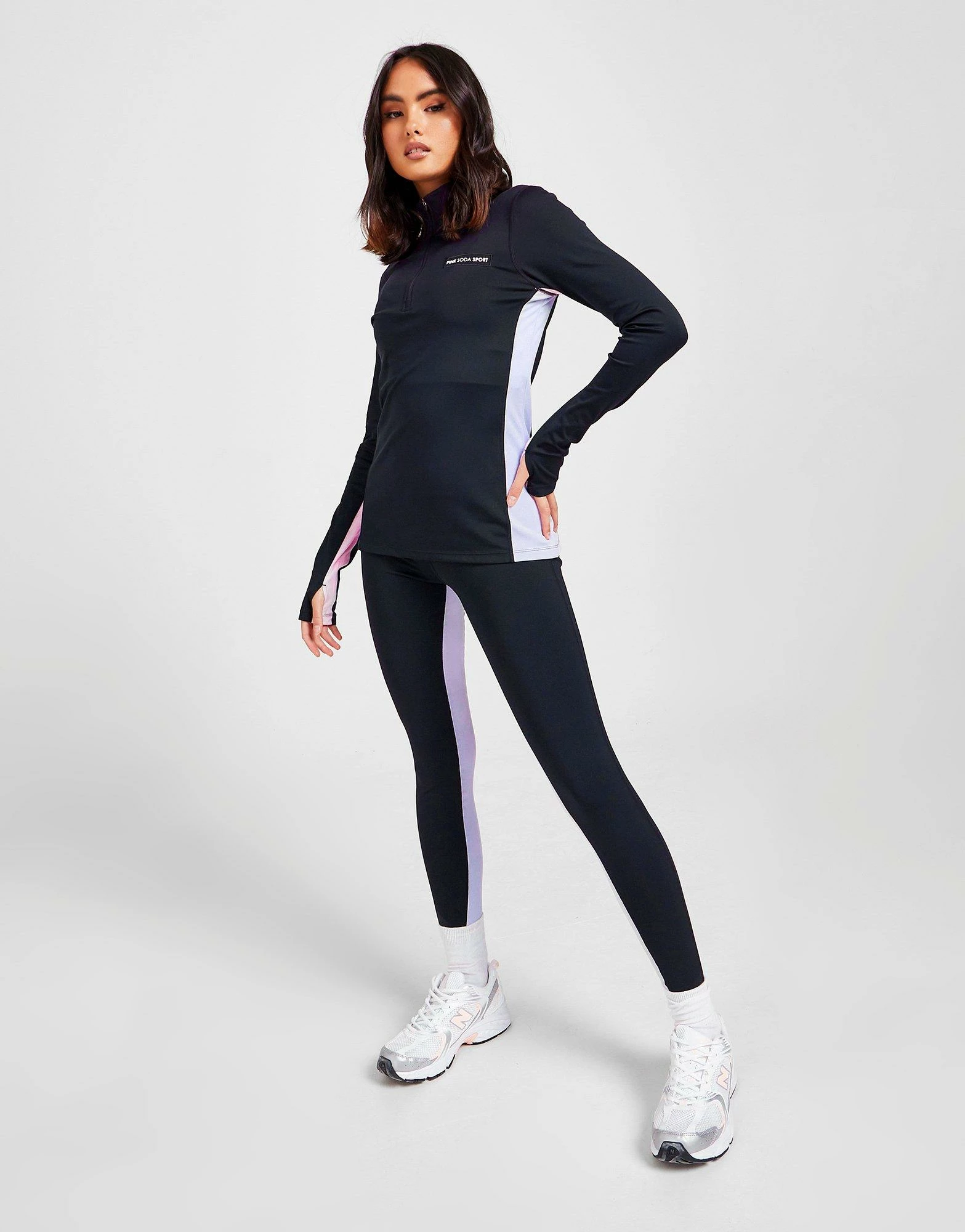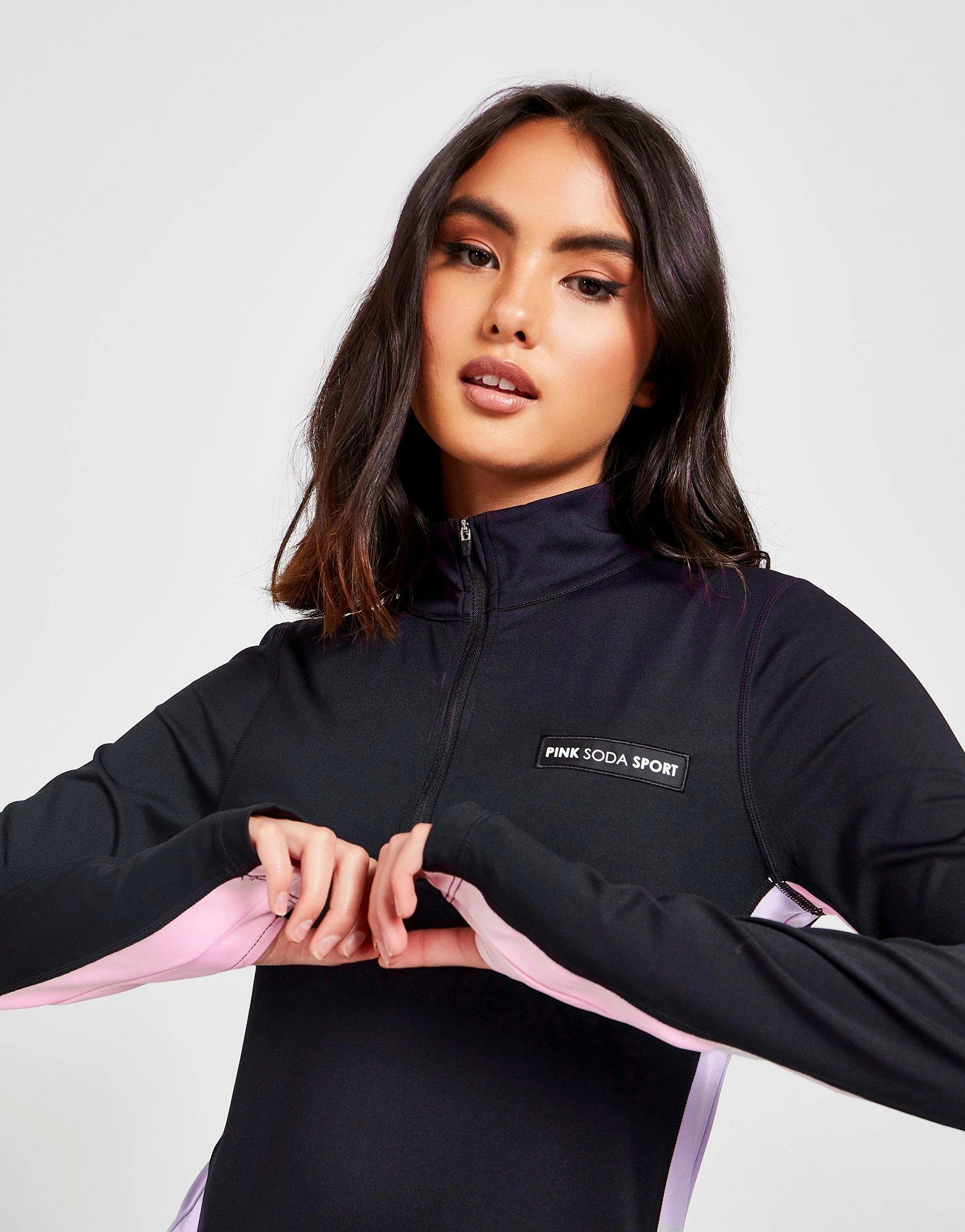 Level up your fitness essentials with this women’s Breeze 1/4 Zip Top from Pink Soda Sport. Coming in a black colourway with pink and lilac colour block panels, this slim-fit top is made with ultra-smooth recycled poly with added stretch for supreme comfort from the workout to the streets. It features a 1/4 zip closure with a raised collar to adjust your look and your airflow, and long sleeves with thumb-loops to secure the shape. Finished up with classic Pink Soda Sport branding to the chest. Machine washable. | Our model is 5’6″ and wears a size 8.