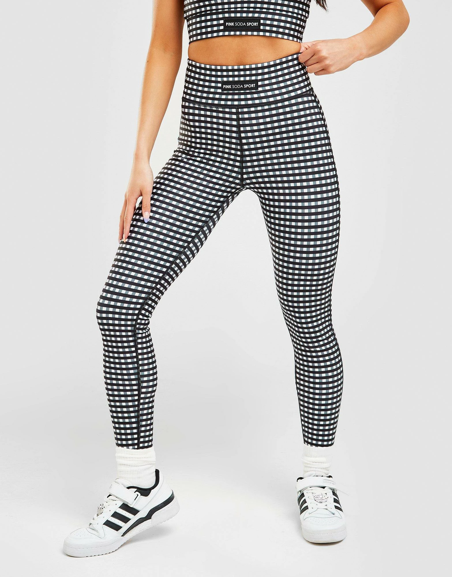 Standout when you pull on these women’s Gingham Tights from Pink Soda Sport. These body-hugging tights come in a Black colourway with an all-over gingham print and are built with a recycled poly fabric that’s light and stretchy. They feature an elastic waistband for a snug, supportive feel and are finished with Pink Soda Sport branding to the waistband. Machine washable. | Our model is 5’6″ and wears a size 8.