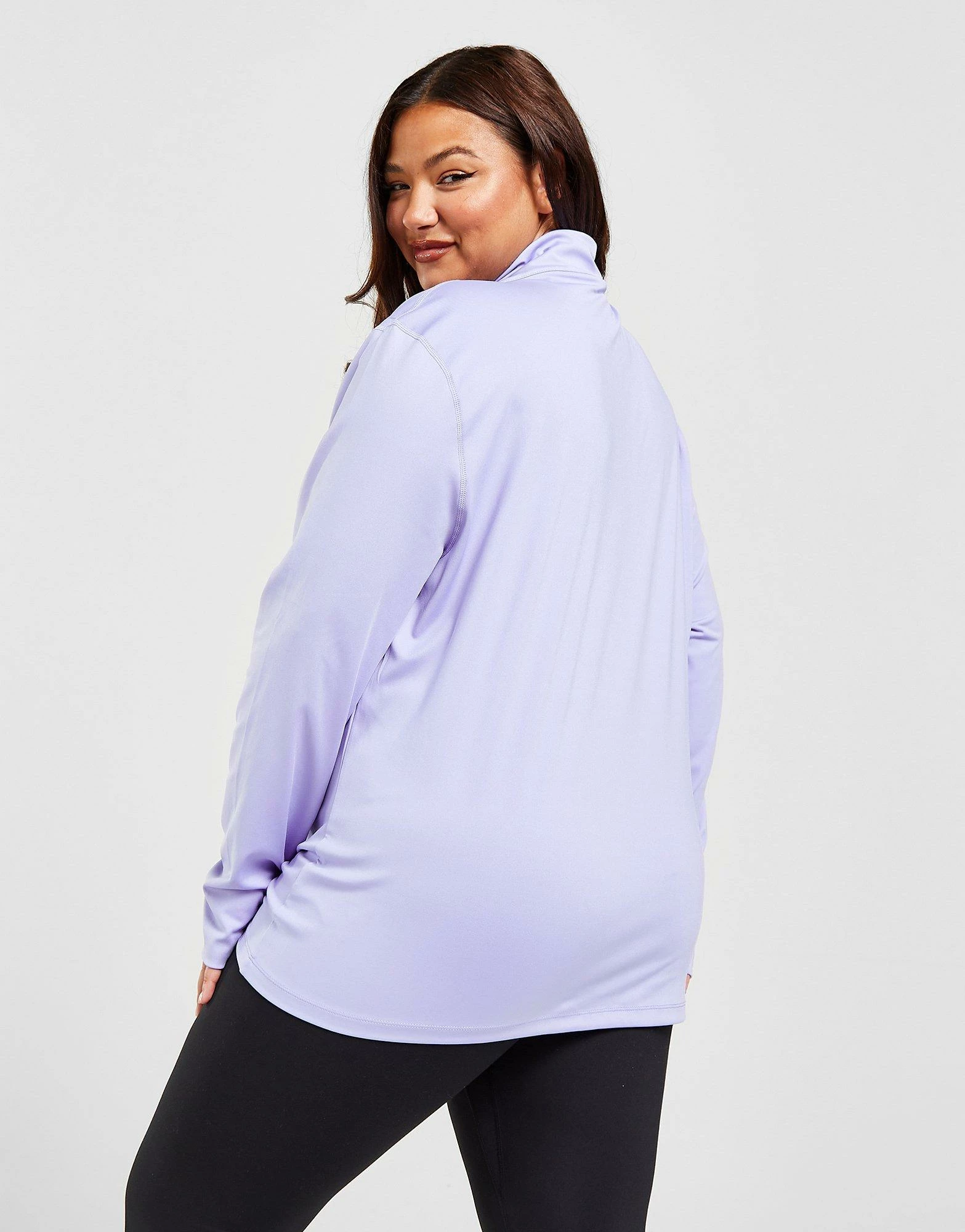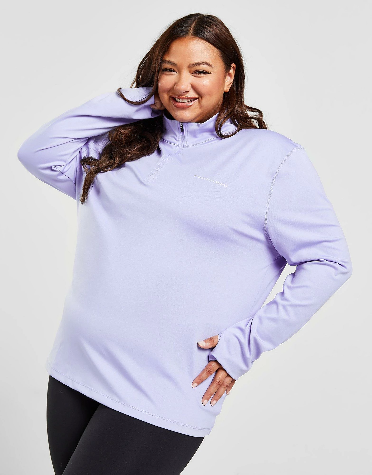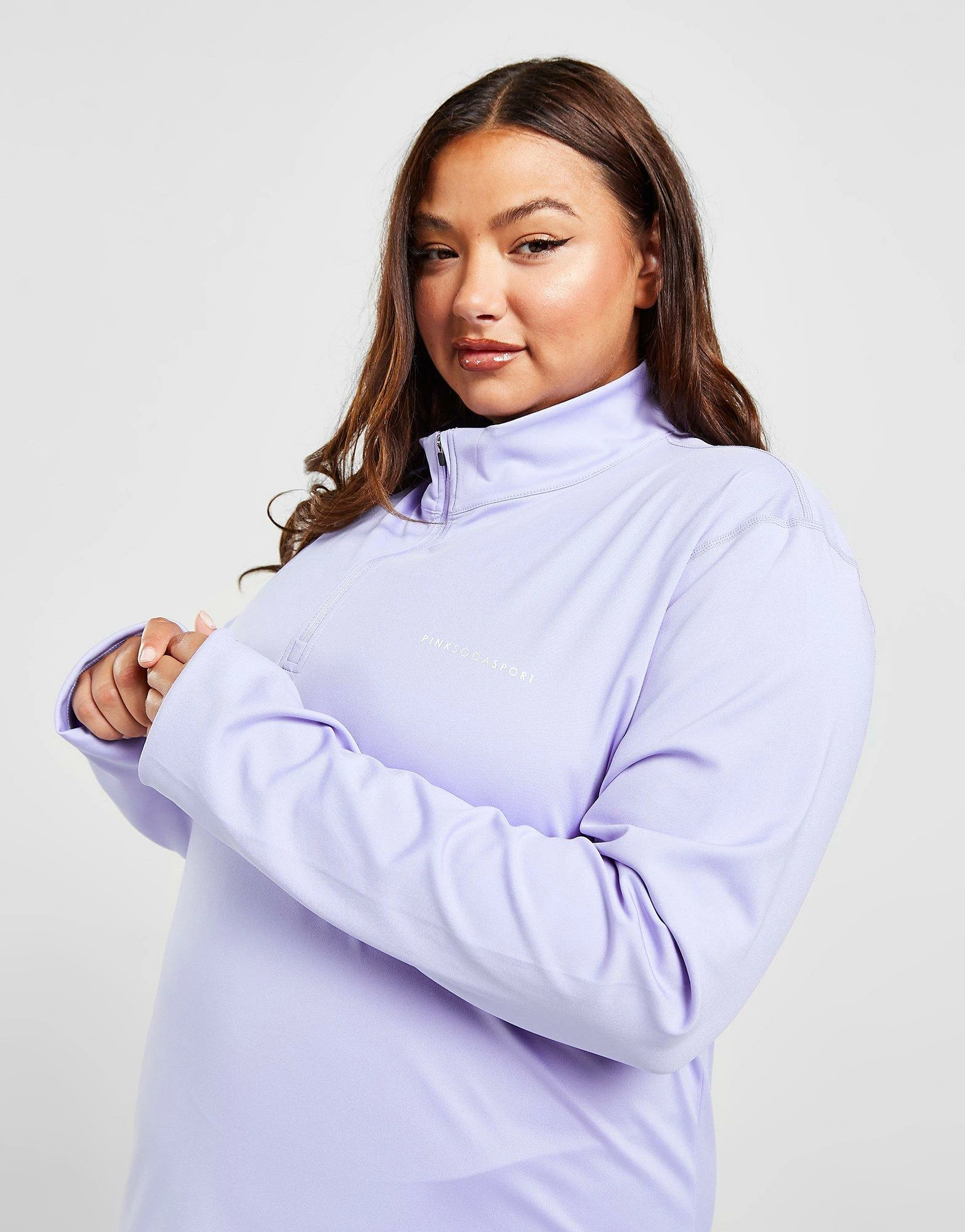 Cop a sporty style with this women’s Plus Size 1/4 Zip Top from Pink Soda Sport. In a Lilac colourway, this top is made from a recycled poly fabric that’s smooth and stretchy for complete comfort. It features a 1/4 zip fastening with a stand-up collar for custom coverage and thumbholes to hold the sleeves in place. Signed off with Pink Soda Sport branding to the chest. Machine washable. | Our model is 5’9″ and wears a size XL.
