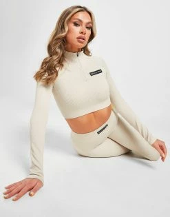 Step up your style with this women’s Rib Seamless 1/4 Zip Top from Pink Soda Sport. This tight-fit top comes in a Cream colourway and is made from a partly recycled poly fabric that’s super-smooth and stretchy for all-day comfy wear. It features a 1/4 zip fastening for custom airflow, long sleeves for coverage and a cropped elasticated hem for a supportive fit. Finished up with Pink Soda Sport to the chest. Machine washable. | Our model is 5’7″ and wears a size 6-8.