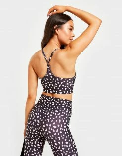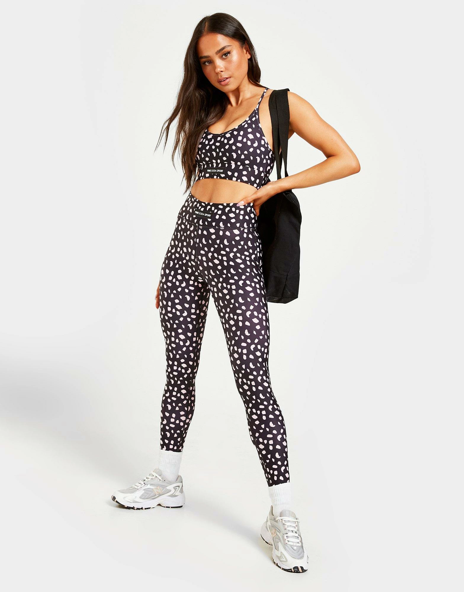 Update your fitness essentials with this women’s Santiago Sports Bra from Pink Soda Sport. Comin’ in a black colourway with an all-over animal print pattern, this tight-fit sports bra is made with smooth, stretchy recycled poly for essential comfort. Delivering light support to your workouts, it features a scoop neckline, with slim, adjustable straps and an open racerback design for breathable wear. Finished up with Pink Soda Sport branding at the underband. Machine washable. | Our model is 5’6″ and wears a size 8.