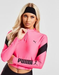 For bold style in and out of the gym, look no further than this women’s Fit Crop 1/4 Zip Top from PUMA. In a Sunset Pink colourway, this slim-build training top is made from at least 20% recycled materials, with built-in EVERSCLUPT compression tech for a stretchy and supportive fit. Using sweat-wicking dryCELL tech to keep you cool, it features a 1/4-zip fasteing and raised collar for added airflow, while the cropped hem provides an unrestricted wear. This top is finished up with contrasting Black panels and PUMA Cat branding to the chest and sleeve. Machine washable | Our model is 5’5″ and wears a size small.