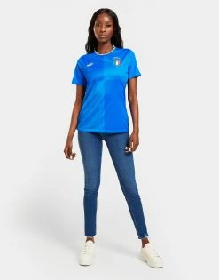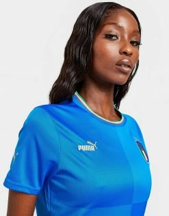 Rep your nation’s colours with pride in this women’s Italy 2022 Home Shirt from PUMA. In the classic blue colourway, this regular-fit shirt celebrates a legacy of iconic football with gold accents, retro fonts and a tonal quadrant print that nods to the four World Cup winning sides. It’s made from lightweight poly fabric, and uses signature dryCELL tech to wick sweat from the skin. Cut with a crew neck collar and short sleeves, this jersey is finished off with PUMA Cat branding and the legendary Italy crest to the chest. Machine washable. | Our model is 5’7.5″ and wears a size small.