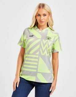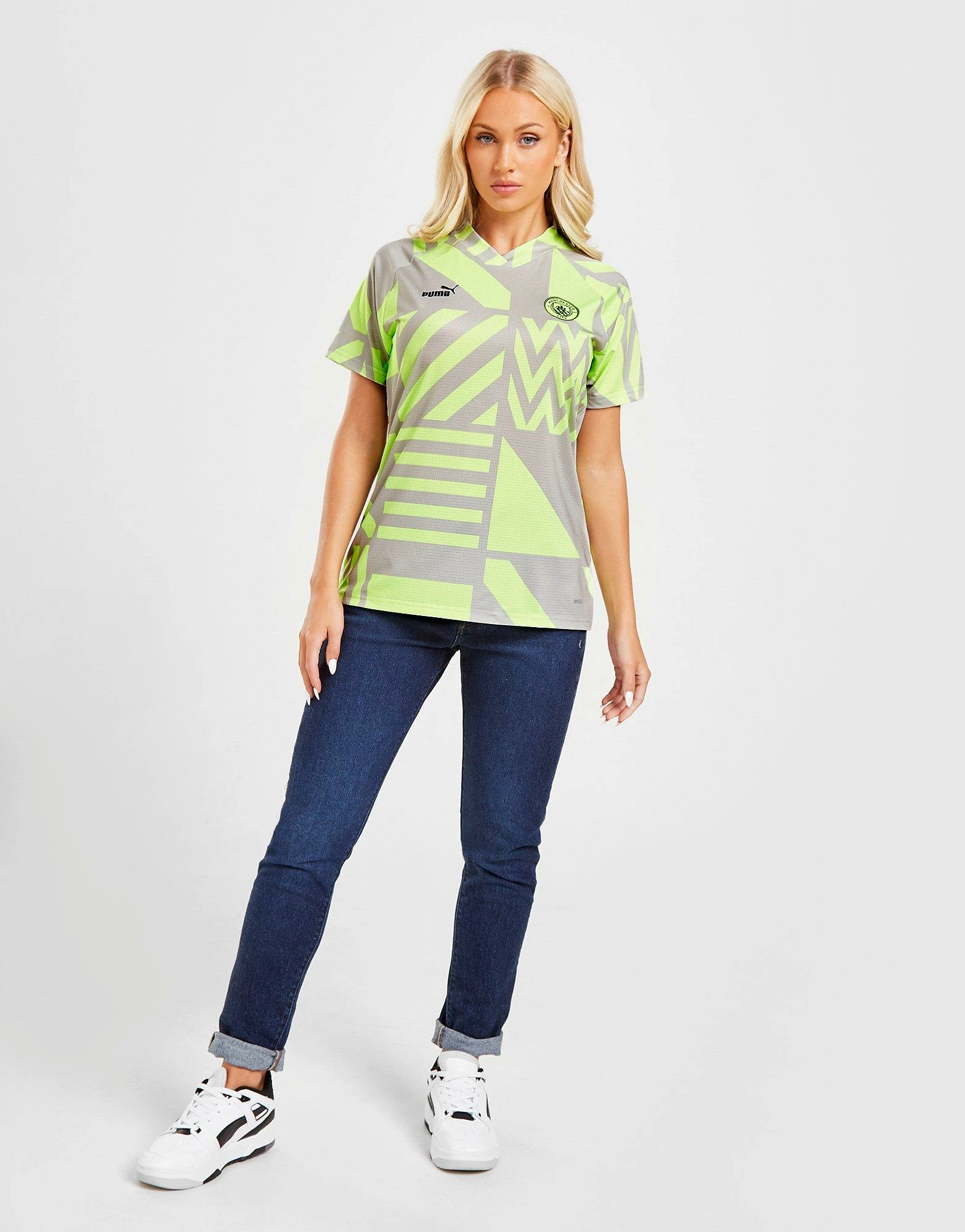 Show your Cityzens pride ahead of the game in this women’s Manchester City FC Pre Match Shirt from PUMA. Landing in a Fizzy Light and Grey Violet colourway with an all-over geometric pattern, this shirt is made with a smooth, lightweight stretch-woven poly fabric for essential comfort. It features a V-neckline and short, raglan sleeves for unrestricted movement and a game-ready feel. Crafted with sweat-wicking dryCELL tech, it’s finished up with PUMA branding at the chest, alongside the legendary Manchester City FC crest to sign off. Machine washable. | Our model is 5’5″ and wears a size small.