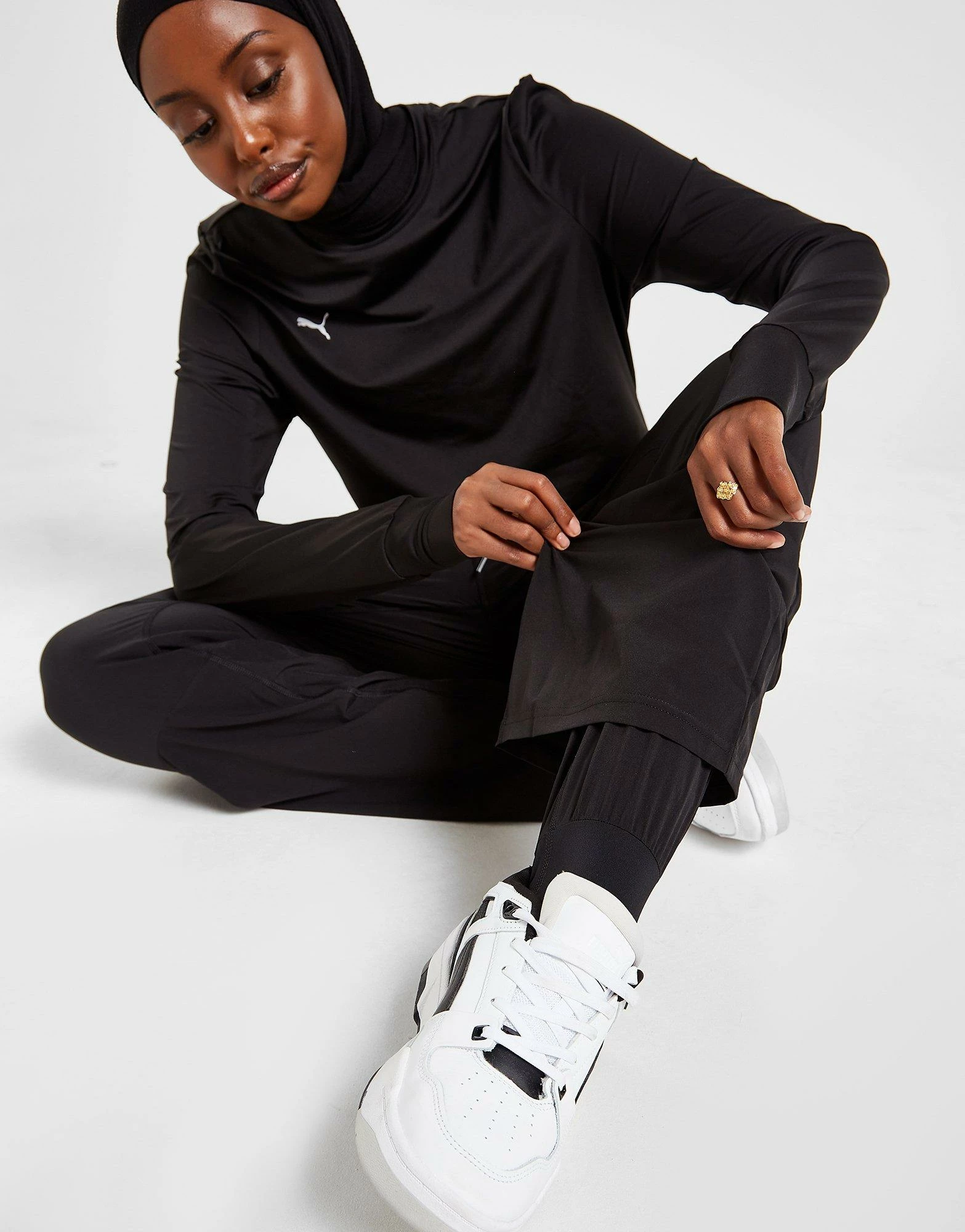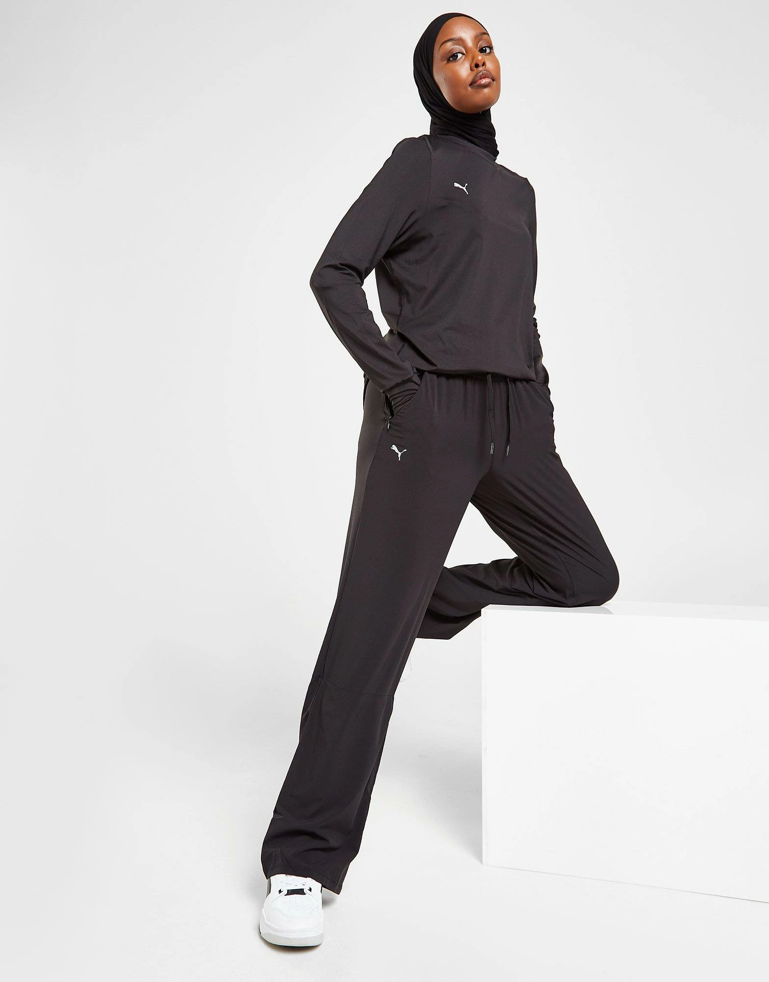 Stay covered when you train with these women’s Modest Wide Leg Track Pants from PUMA. In a PUMA Black colourway, these roomy training pants are made from stretchy poly fabric for lightweight comfort, while sweat-wicking dryCELL tech keeps you cool. They feature an elasticated waistband with a drawcord tie for a custom fit, while the zippered side pockets secure your essentials. These pants are finished off with a signature PUMA Cat logo to the left thigh. Machine washable. | Our model is 5’6″ and wears a size small.