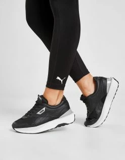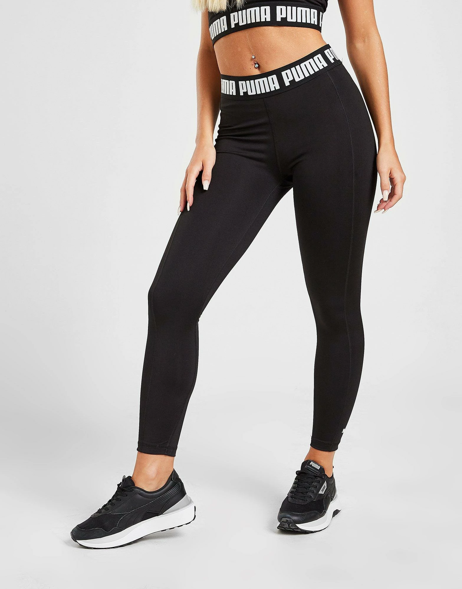 Refresh your fitness essentials with premium looks from PUMA in these women’s Strong Tights. Made from ultra-smooth, sweat-wicking poly fabric, these leggings have added stretch to keep your comfort covered. They come in a high-rise design, with a thick, elasticated waistband for a secure feel. In a black colourway, these tights are finished up with contrasting PUMA branding around the waist, as well as a classic Cat logo to the lower left leg. Machine washable. | Our model is 5’6″ and wears a size small.