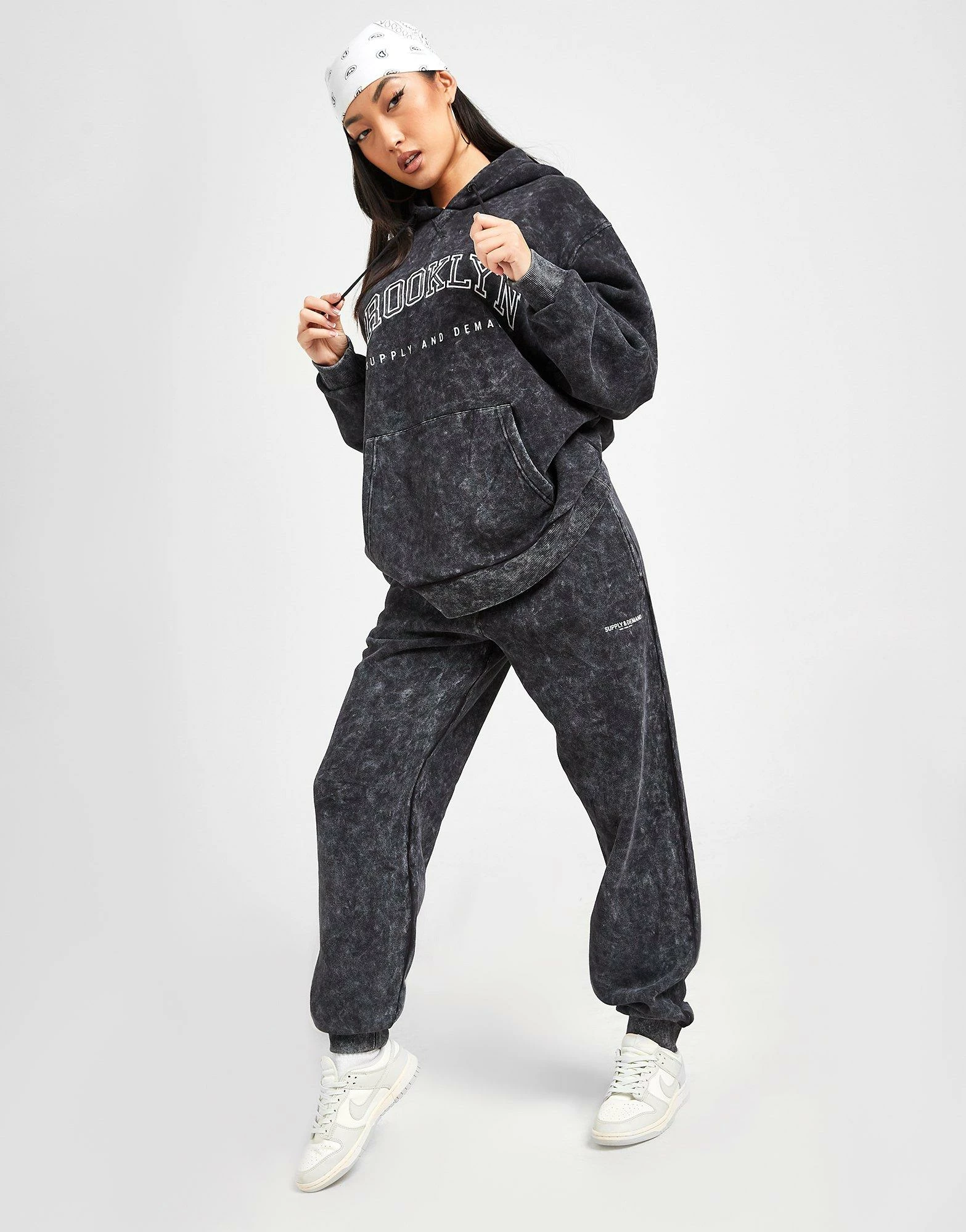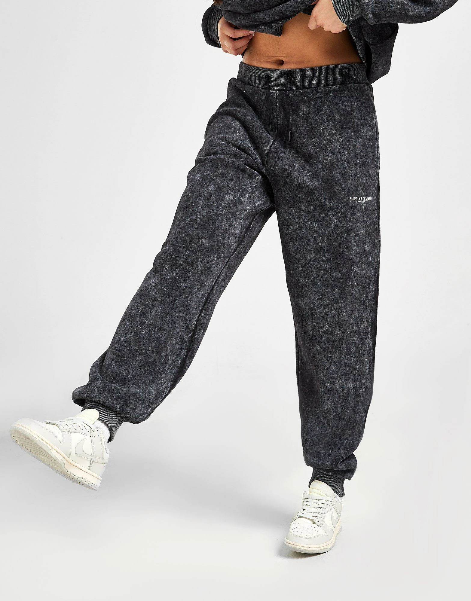 Kick back in these women’s Logo Joggers from Supply & Demand. Coming in a Black Wash colourway, they’re made with smooth cotton-poly fleece fabric for cosy comfort on chilled days. With a slightly oversized fit for a laidback vibe, they feature an elasticated waistband with adjustable drawcords for custom wear, with ribbed cuffs at the ankles to optimise the fit. While side pockets offer essential storage, these joggers are signed off with Supply & Demand branding at the thigh and waistband. Machine washable. | Our model is 5’8″ and wears a size 8.