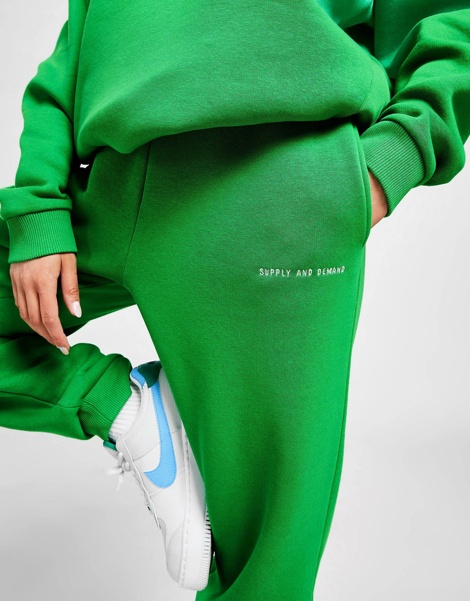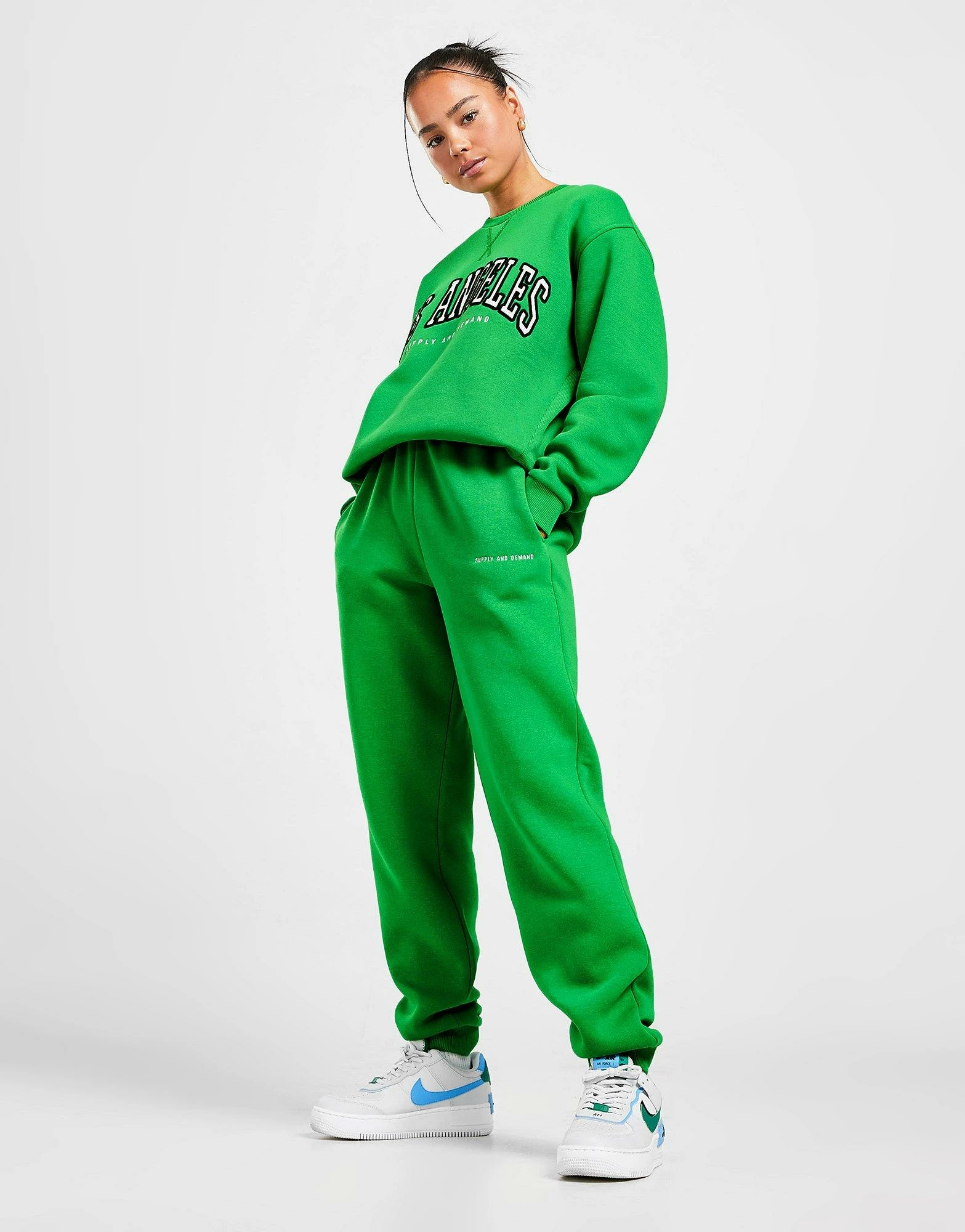 Sport the collegiate trend with these women’s Varsity Logo Joggers from Supply & Demand. Exclusive, these regular-fit pants are made from soft poly-cotton fleece with a cosy, brushed-back inner for warmth. They come in a bold Green colourway and feature ribbed cuffs and a high-rise, elasticated waistband with an adjustable draw cord for a custom fit. With two side pockets, these joggers are finished up with Supply & Demand branding embroidered to the thigh. Machine washable. | Our model is 5’6″ and wears a size 8.