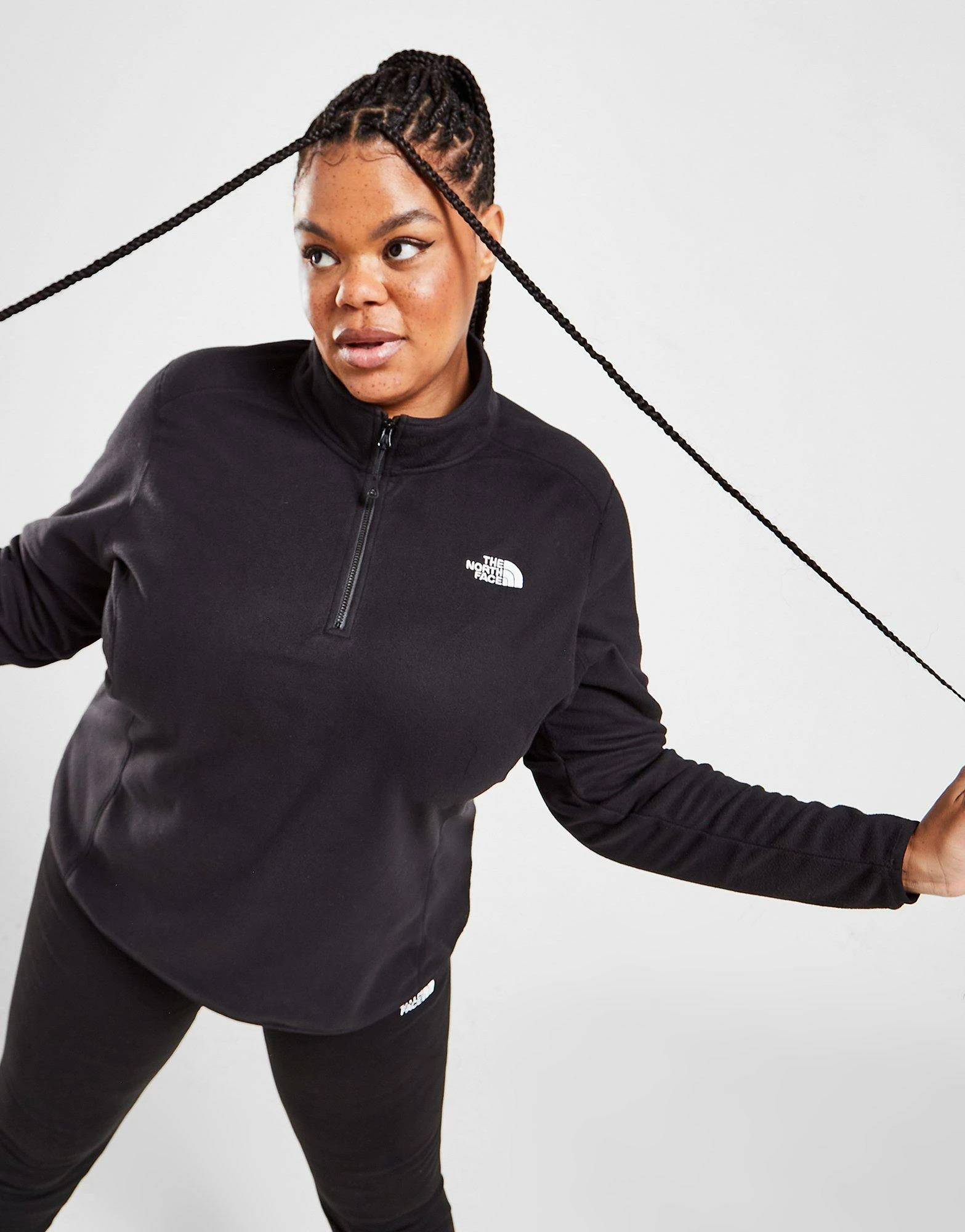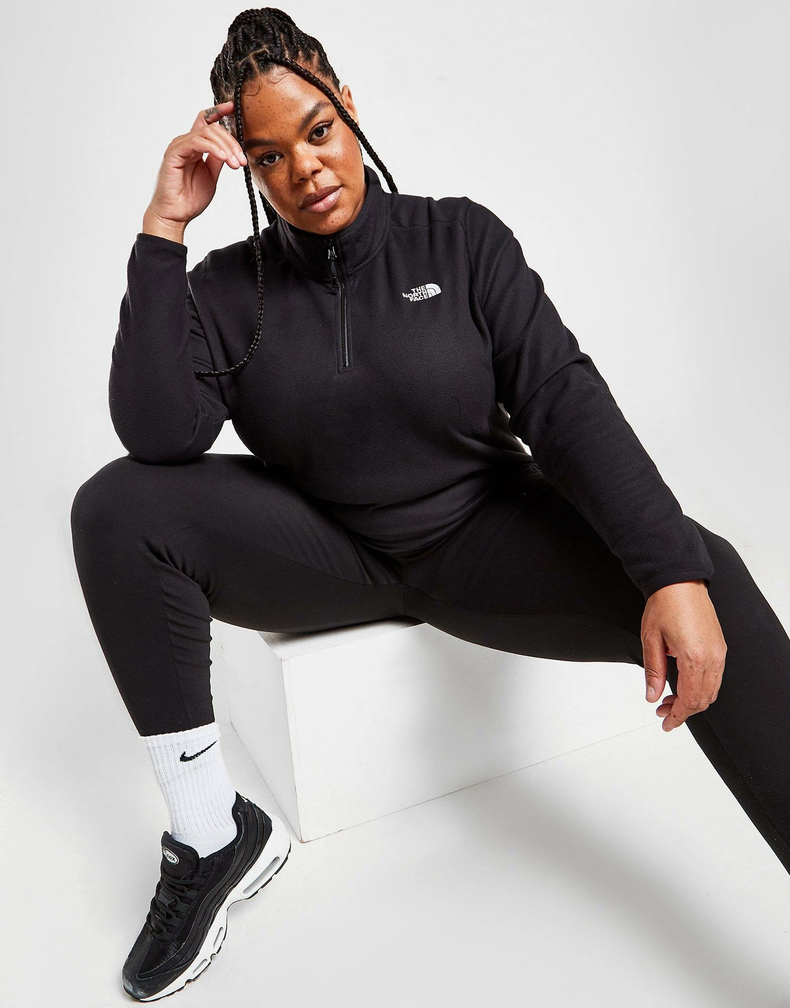 Layer up in an adventure-ready style with this women’s Plus Size Glacier 1/4 Zip Fleece from The North Face. Coming in a black colourway, this lightweight layer is cut from soft, fuzzy fleece for essential comfort. It has long sleeves with a 1/4 zip closure and a raised collar to adjust your airflow, with a stretchy binding at the cuffs to hold ’em in place. Finished up with the iconic The North Face logo at the chest. Machine washable. | Our model is 5’9″ and wears a size XL.