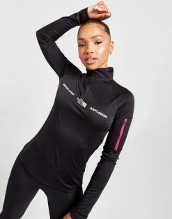 Zip up in a fresh look from The North Face with this women’s Pocket 1/4 Zip Top from The North Face. Exclusive, this slim-fit top is made from smooth poly fabric. It comes in a Black colourway and has an overhead design that features a quarter zip fastening and a risen collar. With long raglan sleeves that have a zipped pocket in pink for small essentials, this track top is finished up with a Never Stop Exploring slogan and signature TNF branding. Machine washable. | Our model is 5’7″ and wears a size small.