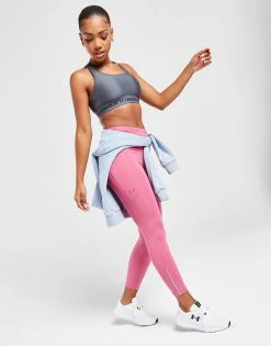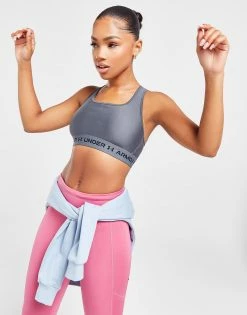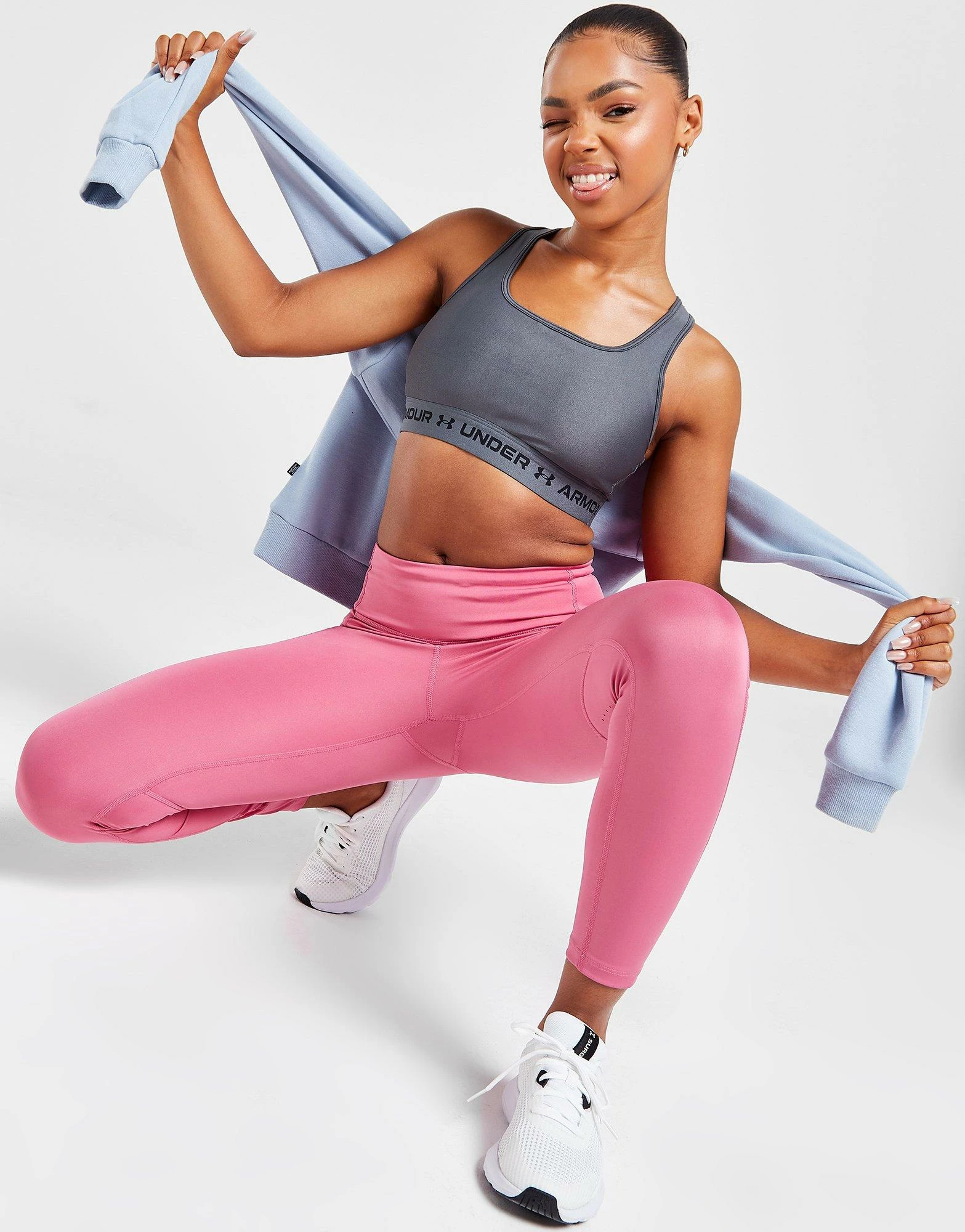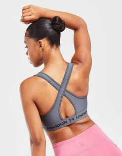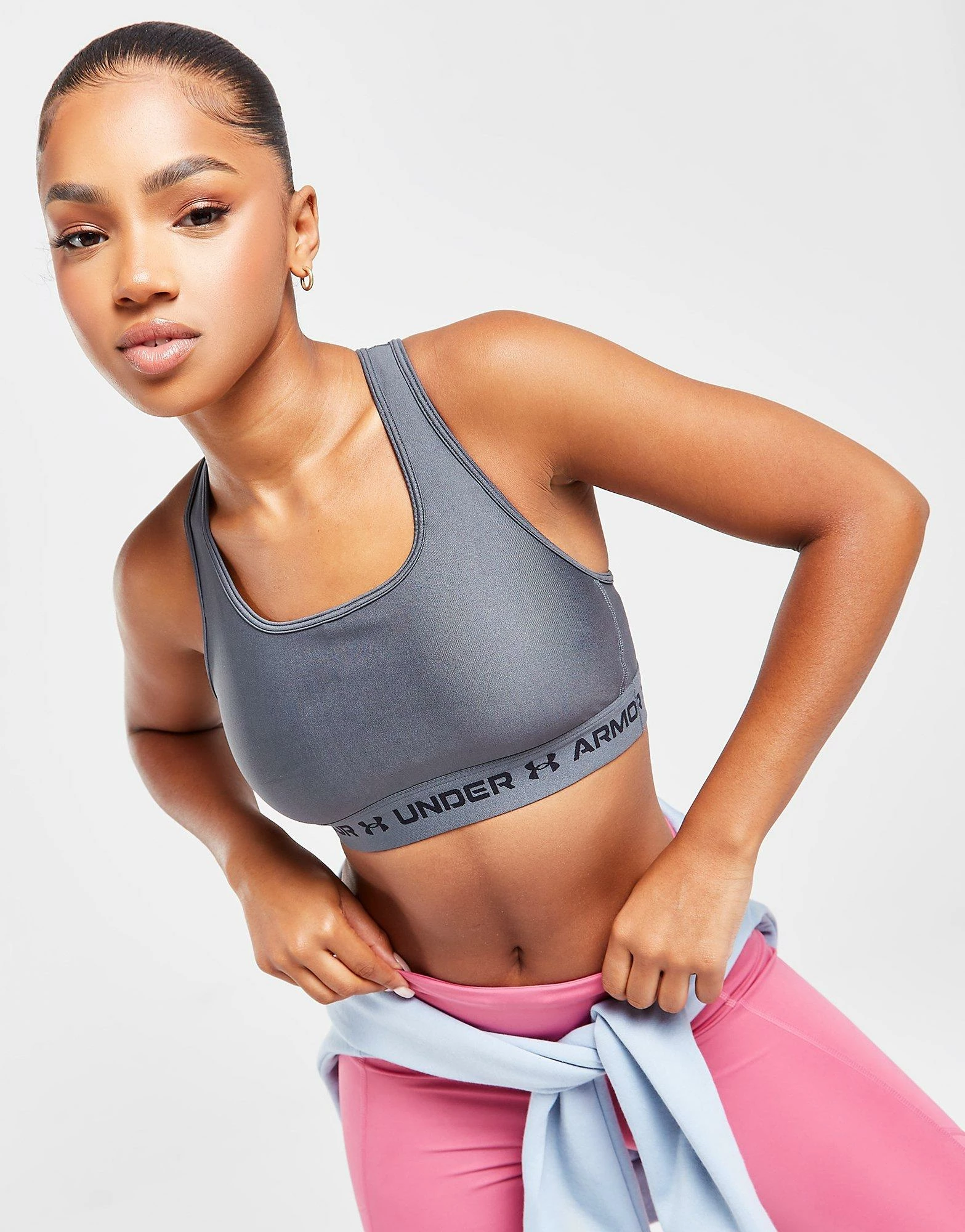 Get essential support for medium activities with this women’s Crossback Sports Bra from Under Armour. This tight-fit bra comes in a Pitch Gray colourway and is made with an ultra-smooth and light double-layer HeatGear fabric that wicks away sweat for cool comfort. It features removable cups for custom wear, crossover straps for a secure fit and an elastic band for a supportive feel. Finished with UA branding to the band. Machine washable. | Our model is 5’7″ and wears a size small.