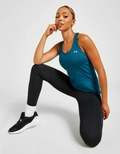 Freshen up your training ‘fits with this women’s HeatGear Armour Racer Tank Top from Under Armour. In a Tourmaline Teal colourway, this ultra-lightweight tank top is made from breathable poly fabric, with HeatGear tech for cool, sweat-wicking comfort. It features a scoop neckline and racerback design for added airflow and unrestricted movement. Finished off with mesh panels and signature UA branding to the chest in White. Machine washable. | Our model is 5’8″ and wears as size small.
