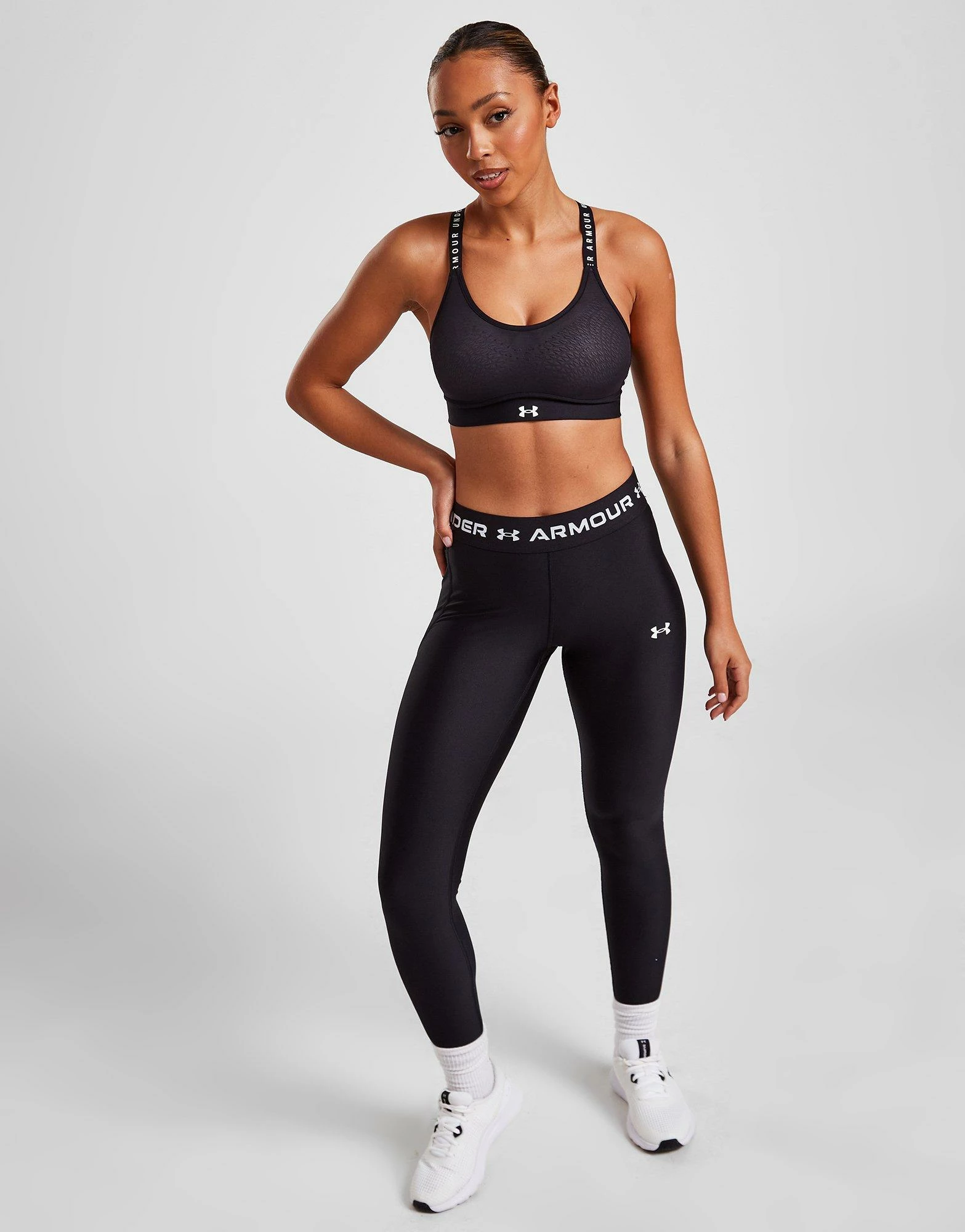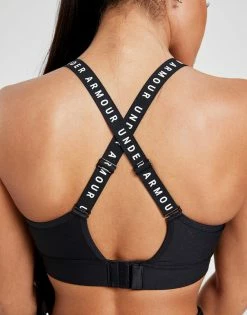 Få komfort og støtte i denne Logo BH fra Under Armour med futuristisk mønster. Denne BH giver middel støtte og er produceret af lækkert, svedafvisende materiale i sort farvenuance. Den er perfekt til løbetræning og spinding og lander med rund hals og elastiske krydsstropper på bagsiden, så du har frihed til bevægelse. Rundes af med Under Armour logo løbende rundt i underkanten. Tåler maskinvask.