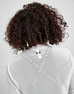 Add a fresh layer to your workouts with this women’s Mesh Long Sleeve Super-Crop Top from Under Armour. In a white colourway, this super-cropped fitness top is built from all-over Iso-Chill mesh fabric, with sweat-wicking tech for an ultra-cool and comfy wear. Featuring a mock neck and long sleeves, it’s finished off with a contrasting UA logo to the nape. Machine washable. | Our model is 5’6″ and wears a size small.
