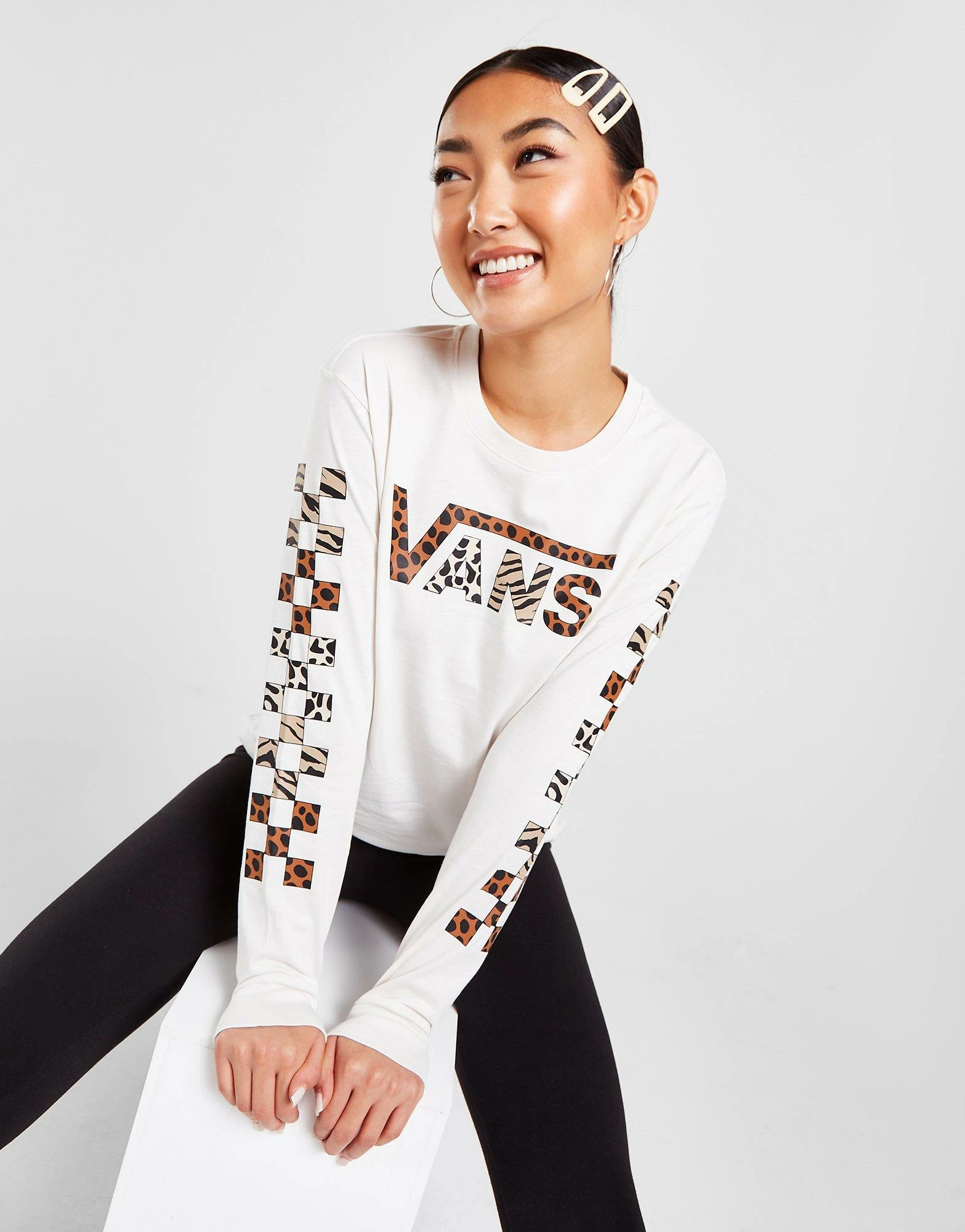 Upgrade your look with this women’s Leopard Infill Long Sleeve T-Shirt from Vans. In a Cream colourway, this regular-fit tee is cut from a cotton fabric that’s ultra-soft and lightweight for all-day comfort. It features a crew neckline and long sleeves with the iconic checkerboard print. Signed off with Vans branding to the chest. Machine washable.